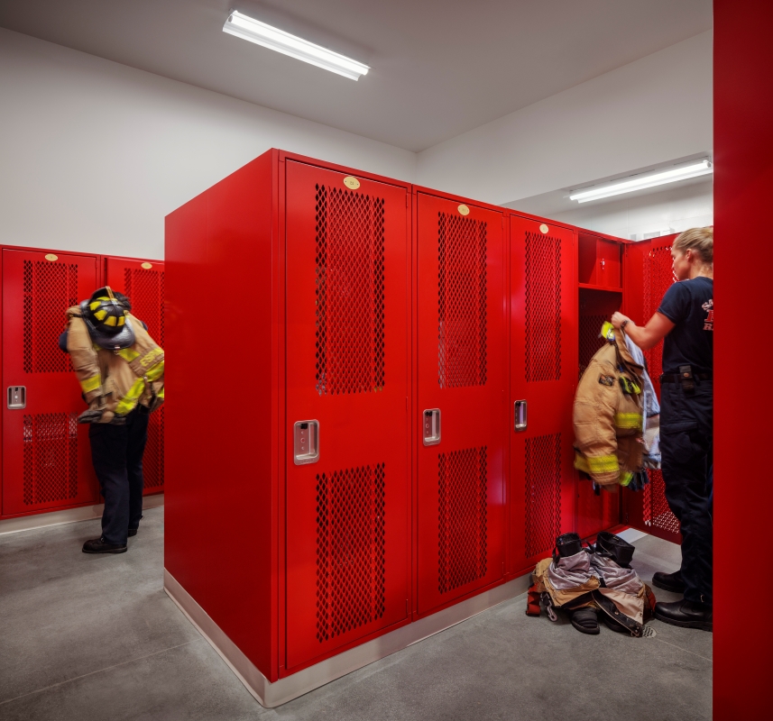 In addition to rapid response, the station emphasizes firefighter health—a growing concern in the profession. The floor plan is zoned into three contamination-control areas, isolating gear, equipment, and living spaces to reduce carcinogen exposure. These zones support the San Diego Fireman’s Relief Association’s “Clean Air, Clean Body, Clean Gear” initiative.