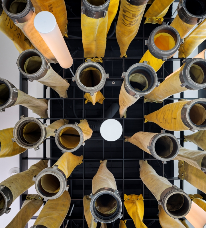 Inside the public entry, a sculptural light fixture fashioned from reclaimed fire hoses pays tribute to the fire service and offers a soft visual counterpoint to the building’s clean lines. At night, the installation glows outward, serving as a civic beacon.