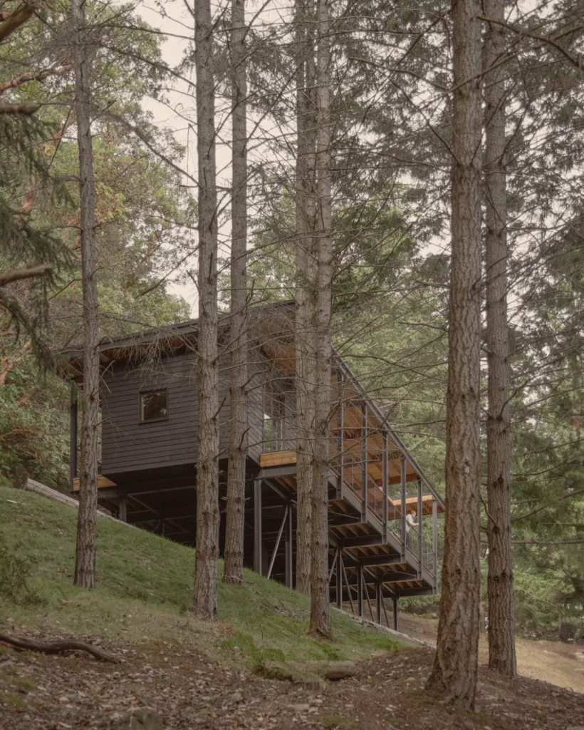 To deliver on Ms. Kinkead’s request, the firm designed a “steel exoskeleton,” Mr. Mattheis said, that rests on concrete footings. The steel structure supports a rectangular deck and flat roof that seem to float among the trees.